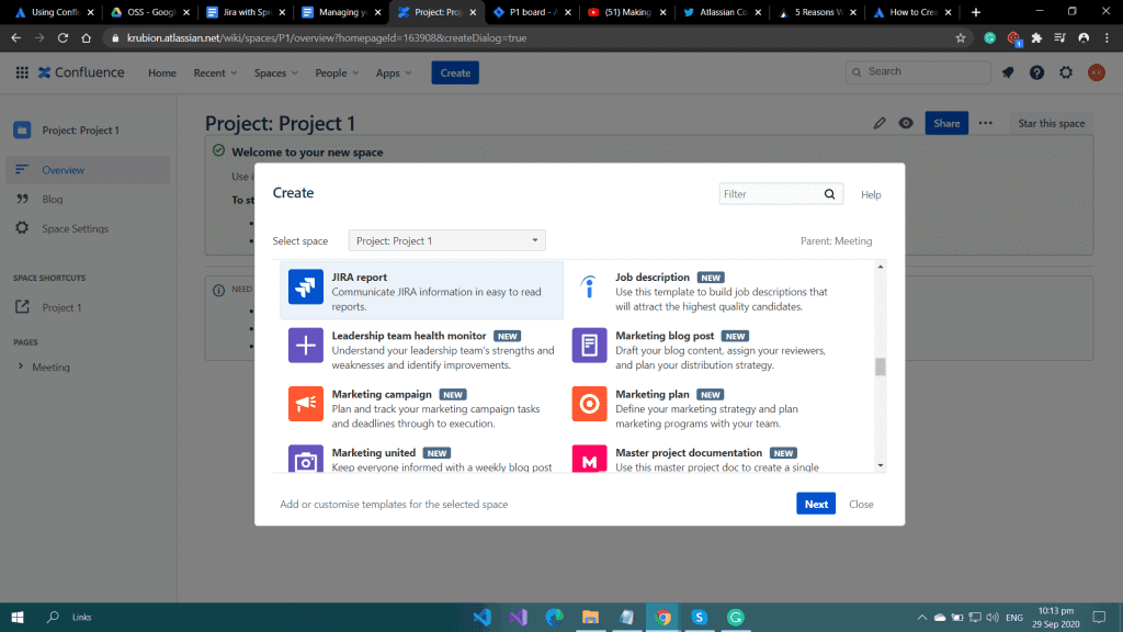 Start by clicking the Create button in the top portion of the Confluence page. Search for Jira report in the list of suggested templates or type “Jira” in the filter.
