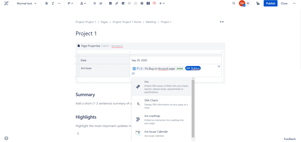In the editor, one powerful tool is the slash “/” command. This loads up a list of macros that you can use when creating or editing your page. This can also be used to link Jira issues.