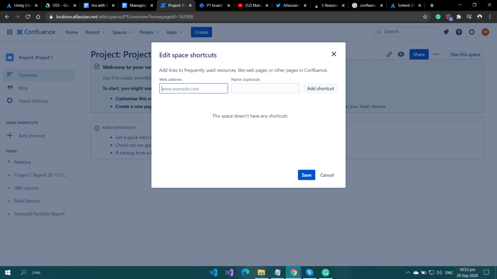 Paste your Jira project URL in the Edit space shortcuts dialog box, and name your shortcut for easy reference then save.