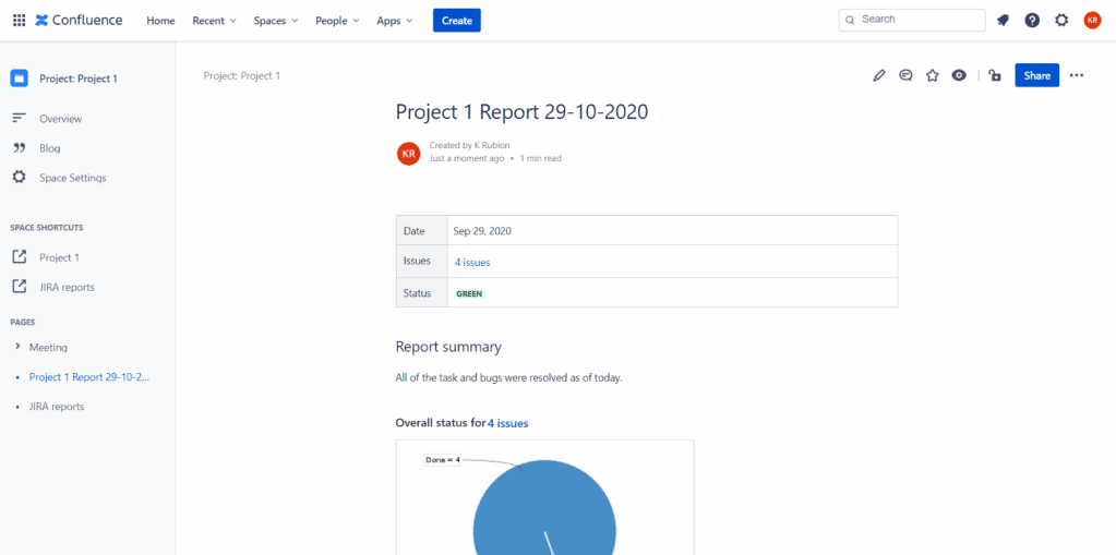 Your status report template should look similar to the image below. If you selected the correct Jira project, then it should show the status of your project, the number of issues and the generated charts.