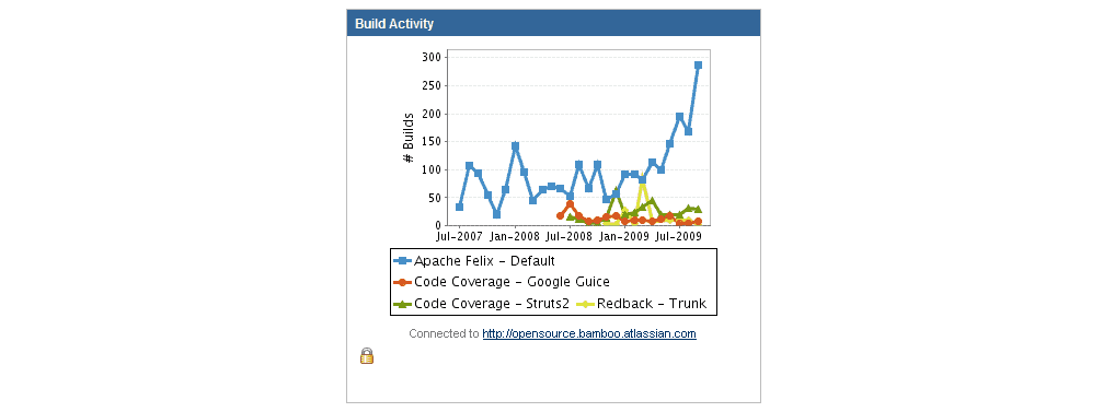 Bamboo is a continuous integration and deployment tool that combines automated builds, tests, and releases in a single workflow, and connects with Jira Software. If you have Bamboo, then the Bamboo Charts gadget is a great choice for a wallboard. It displays various charts and plan statistics from a particular Bamboo server, showing everyone the status and health of the build and thereby giving visibility to the most important metric your team maintains.