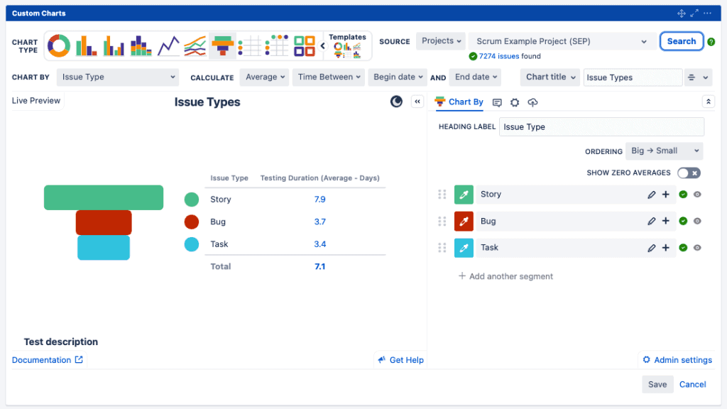Use the Time Between calculation option to see how long tests are taking. Xray comes with Begin/End dates, and calculating the average time it takes tests to be completed can help you understand if there are any bottlenecks or limitations that need to be addressed. In the funnel chart below, we’ve even renamed this column to Testing Duration to make it clear to users viewing the chart what this value represents. We’ve broken it down by issue type, but this chart could also be useful if you wanted to display testing duration by assignee, component, or even epic.