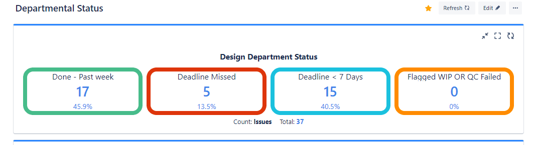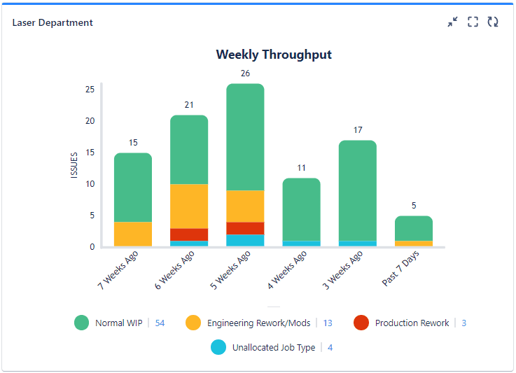 Using Custom Charts for Jira, CFAM create sprint planning dashboards to display work and deadlines for the next 7 days. As shown in the Assembly Planning dashboard above, they use 2D stacked bar charts to display monthly throughput, which helps managers to know how much work to expect from each team. They use tile charts to highlight missed deadlines and focus discussions on what needs attending to first. They use tables and more 2D stacked bar charts (Heinrich says that stacked bar charts are CFAM’s favorite chart type!) to show numbers of issues per assignee to evaluate who can and cannot take on more work. And they have Issue Lists offering specific details about outstanding issues.