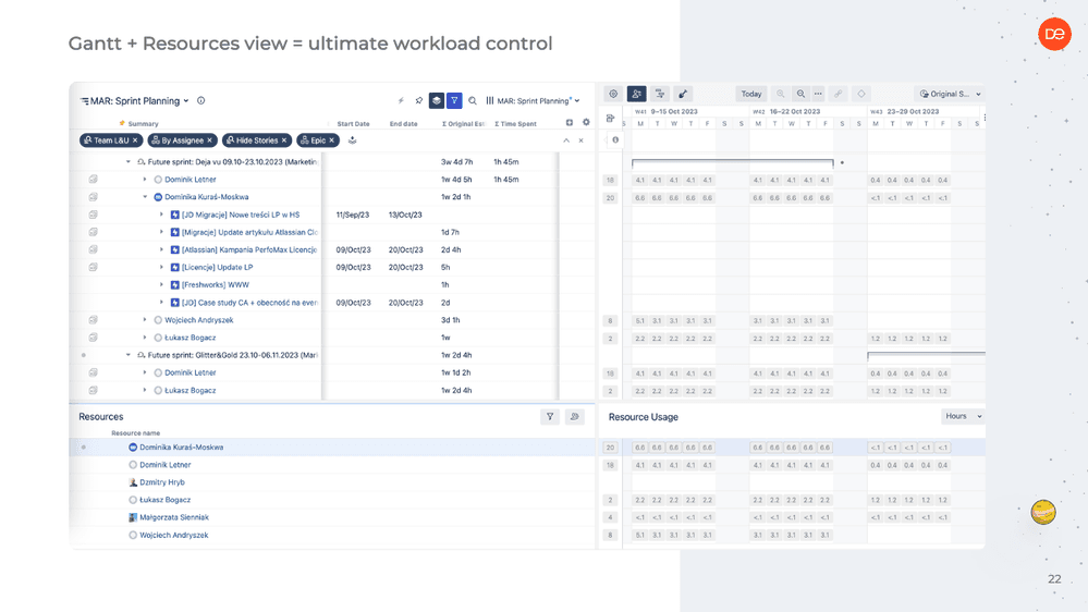 For example, to create more optimal workloads, Hryb and the team check the sum of estimated time per assignee and daily distribution on the resource usage view. At the end of the sprint, they verify estimates versus the actual time spent and talk through the differences during the retro.