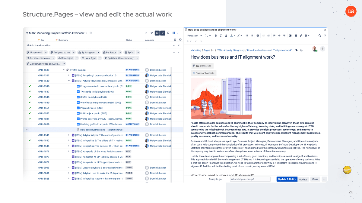 "Displaying linked Confluence pages on the same screen is one of the coolest features I've ever used!" said Hryb, "Now we have our drafts and ready deliverables under each Epic, so the review process is seamless. We can also edit these materials right away, and it respects the space permissions set up in Confluence."