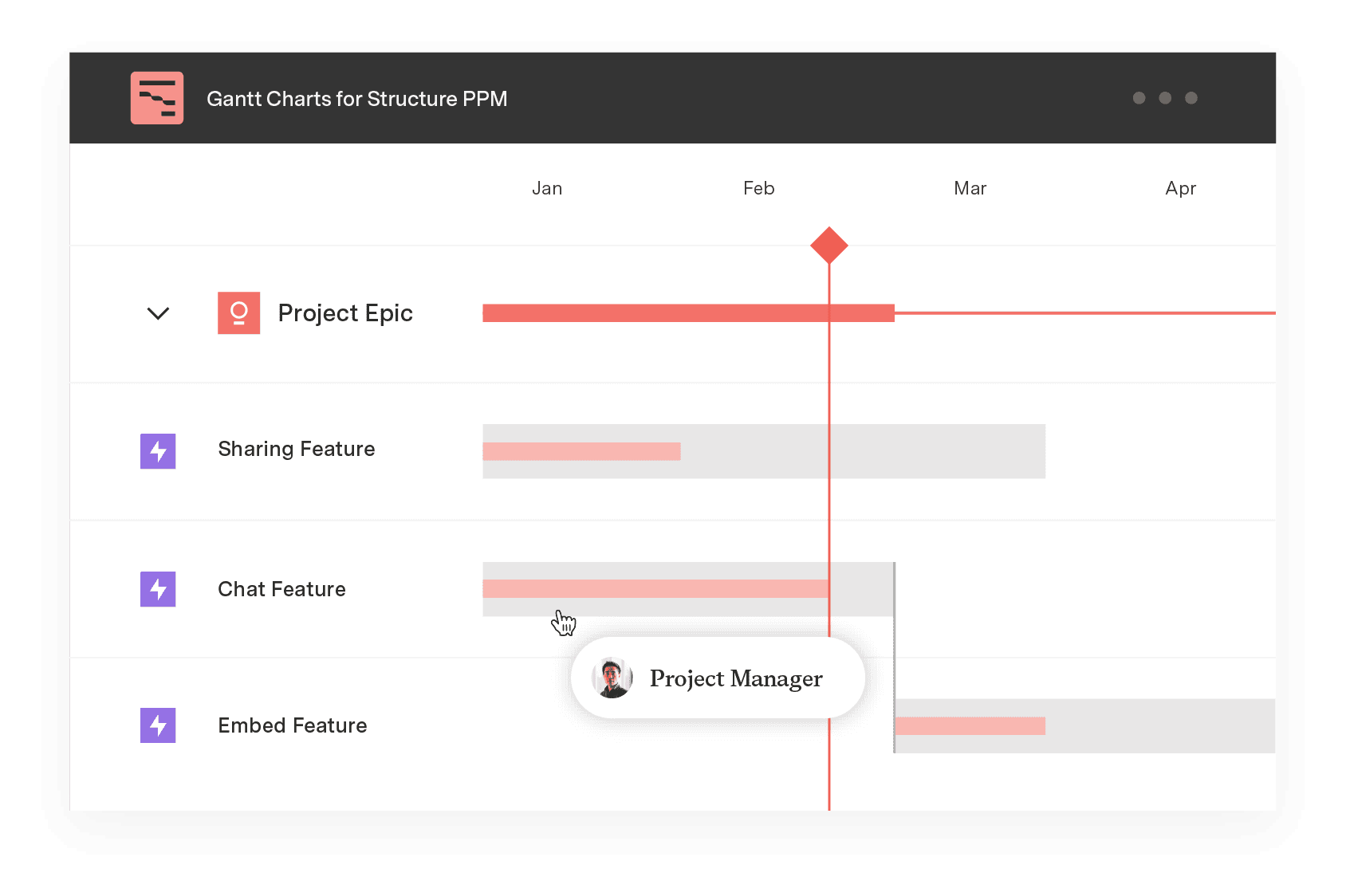 Gantt Charts for Structure works whether you are working agile or waterfall, a large company or a small team. It’ll give your team visualization options for portfolio scheduling, quarterly planning work, capacity visualization, project retros, complex waterfall infrastructure projects, and more.