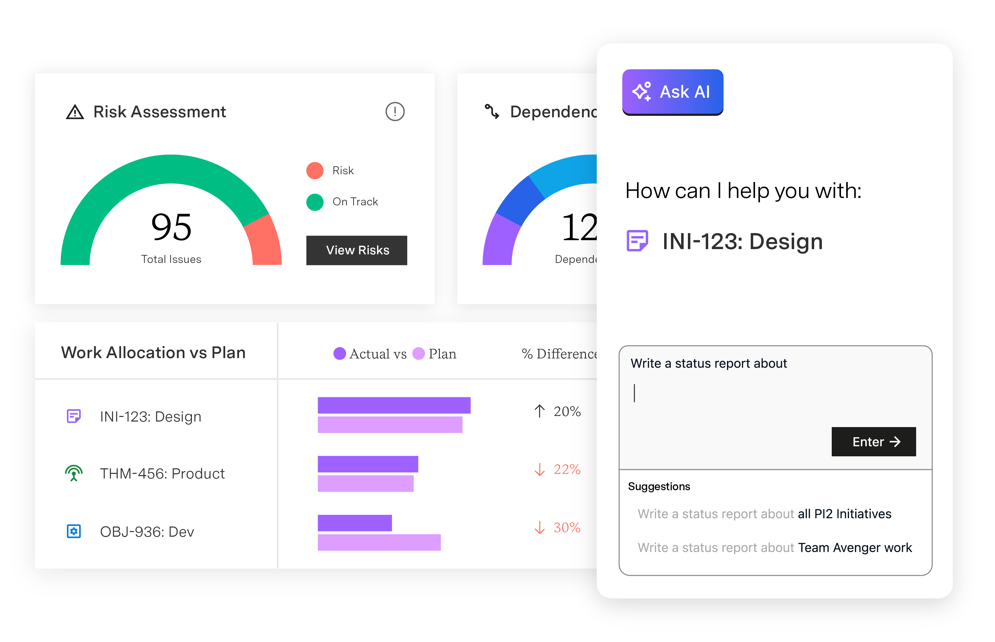 1. Ability to align vision and delivery: Planning leaders need centralized dashboards to track real-time progress on initiatives. Teams can see how their work connects to strategic objectives while leadership maintains oversight of portfolio health – quickly spotting any misaligned efforts and making data-informed decisions.