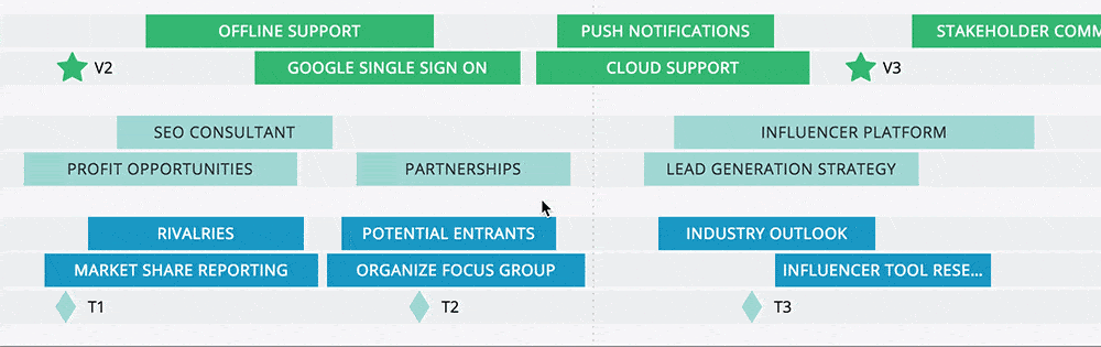 For example, your complete product roadmap might look something like this when plotted on a timeline: