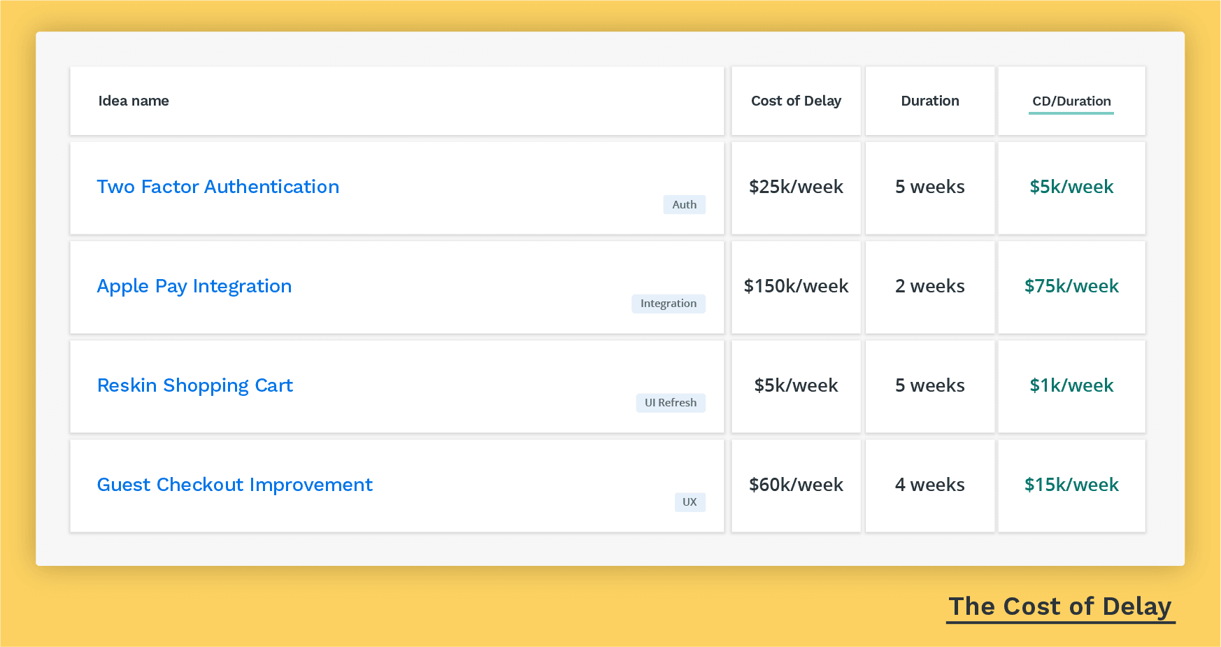 So, let’s say you have one feature that costs you $30,000 per each week that it’s delayed, and it will only take three months to build. On the other hand, you have a feature that costs $10,000 per each week that it’s delayed and it will take you the same amount of time to build. Within this prioritization framework, the first feature would be the one your team focuses on first.