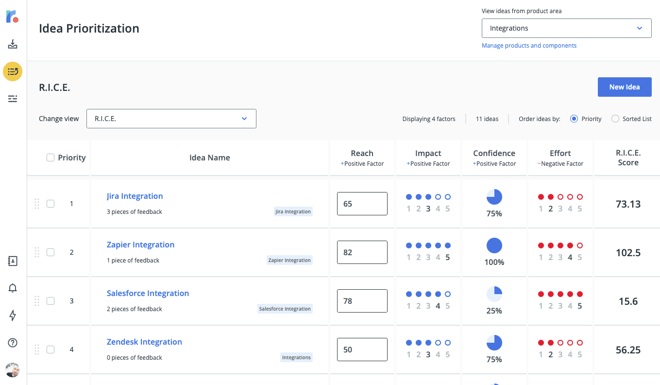 This scoring system measures each feature or initiative against four factors: reach, impact, confidence and effort (hence the acronym RICE). Here’s a breakdown of what each factor stands for and how it should be quantified: