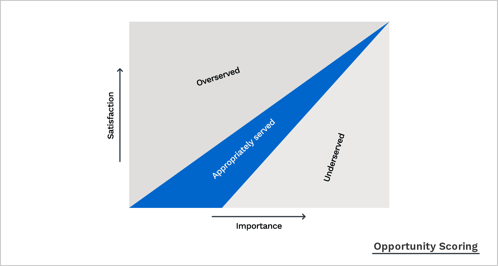 Opportunity scoring uses a Satisfaction and Importance graph to measure and rank opportunities. After you come up with a list of ideal outcomes, you then survey your customers to ask them the following questions: