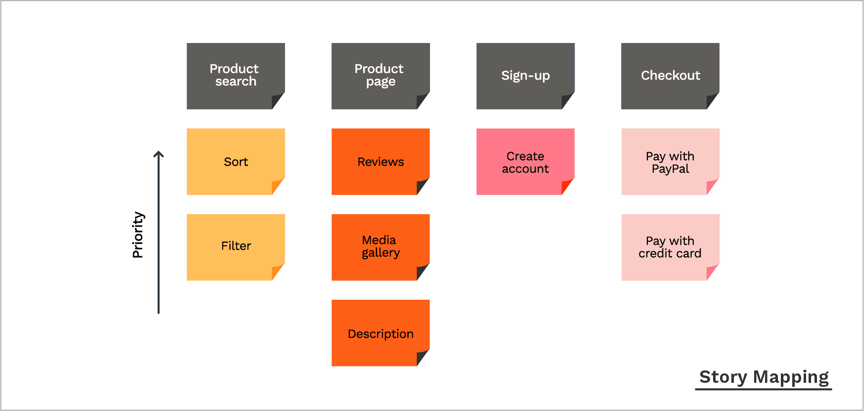 Along a vertical line, you then place these tasks in order of importance, from top to bottom. This allows you to prioritize the order of the features you’ll work on. In some cases, the bottom part of the axis is labeled “Backlog items” for the tasks that you decide to put on hold.
