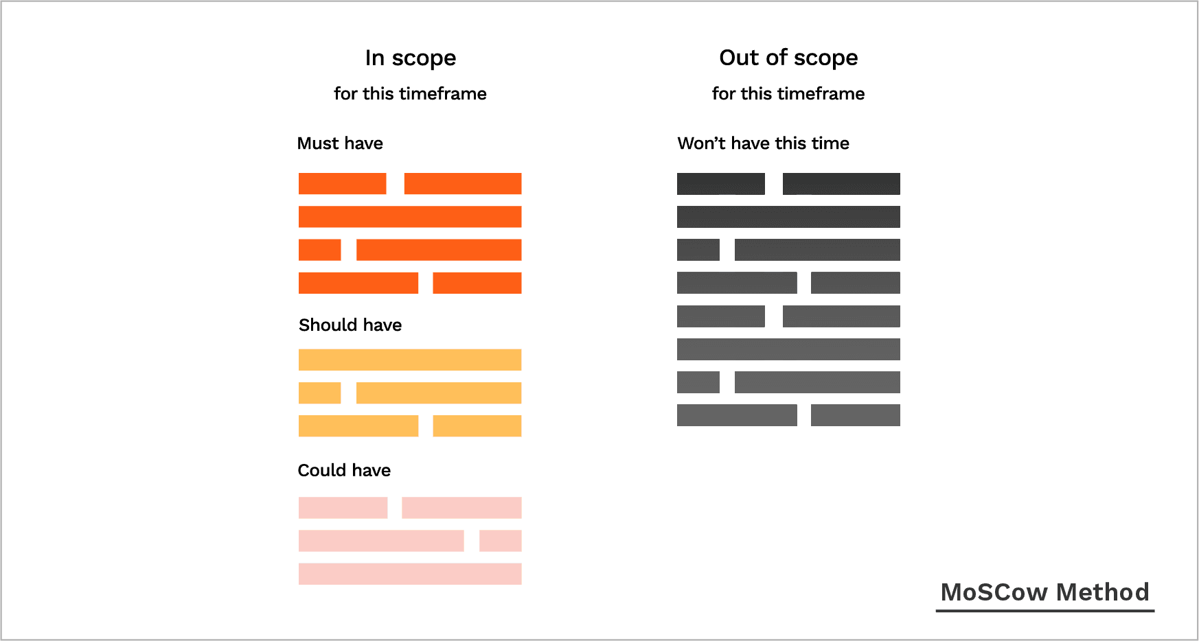 The MoSCoW method allows you to figure out what matters the most to your stakeholders and customers by classifying features into four priority buckets. MoSCoW (no relation to the city – the Os were added to make the acronym more memorable) stands for Must-Have, Should-Have, Could-Have, and Won’t-Have features.