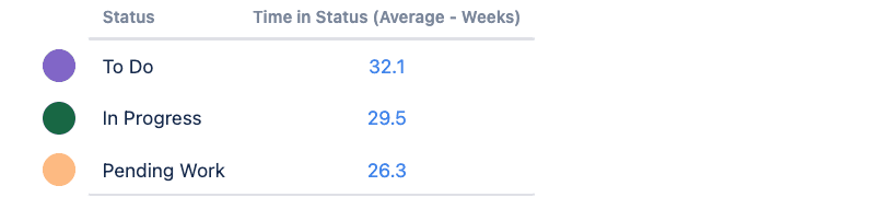 Easily monitor progress with our intuitive time-in-status calculation — keeping you in the loop effortlessly! You can see how long work sits in statuses on average by hours, weeks, or even years.