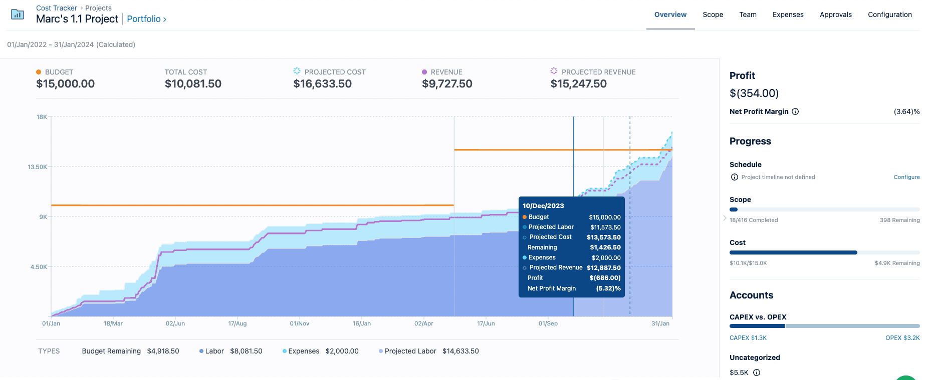 The project overview presents the current KPIs and the projected KPIs that aim to monitor the progress of your projects. The project timeframe covers the dates for all worklogs and planned tasks for the project.