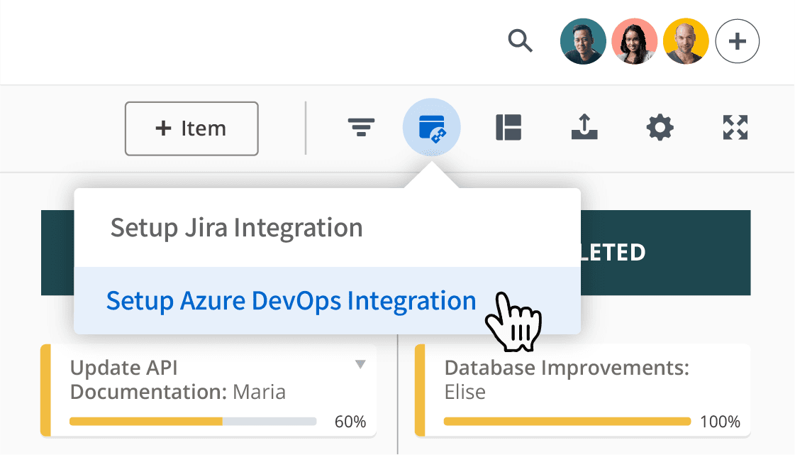 Within your roadmap select the Integrations button in the top right navigation. Enter valid Azure DevOps credentials, select the desired project, and choose what important details will accompany your roadmap.